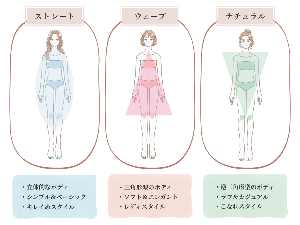 骨格診断とは体型別に似合う形・素材を提案するファッション理論です。骨格診断では、一人一人の筋肉や脂肪、関節の発達しやすさから、以下の3つのタイプと4つの特徴に分類します。
