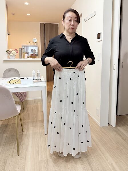 例えばこのような裾が広がったデザインのスカートなどは、腰回りをすっきり見せつつ、曲線的なフレア感もありオススメです^^