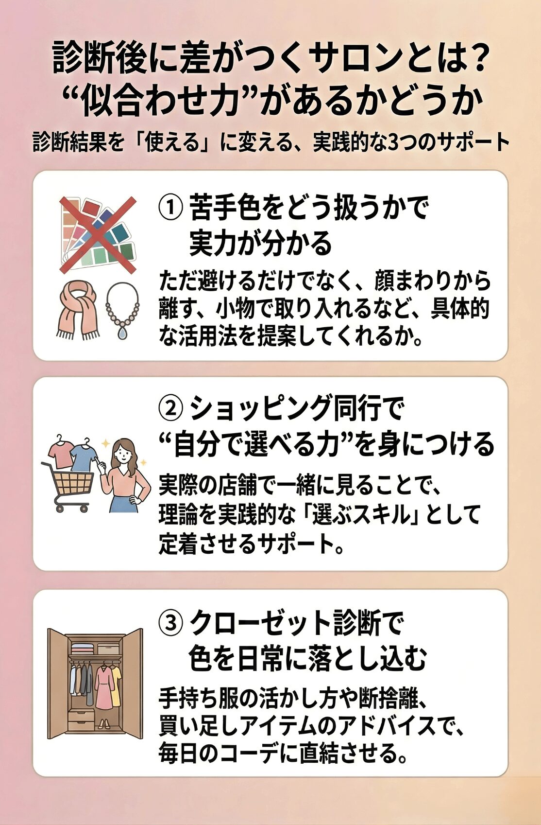 診断後に差がつくサロンとは、「タイプ名を伝える場所」ではなく、色を生活の中で扱えるようにする場所です。