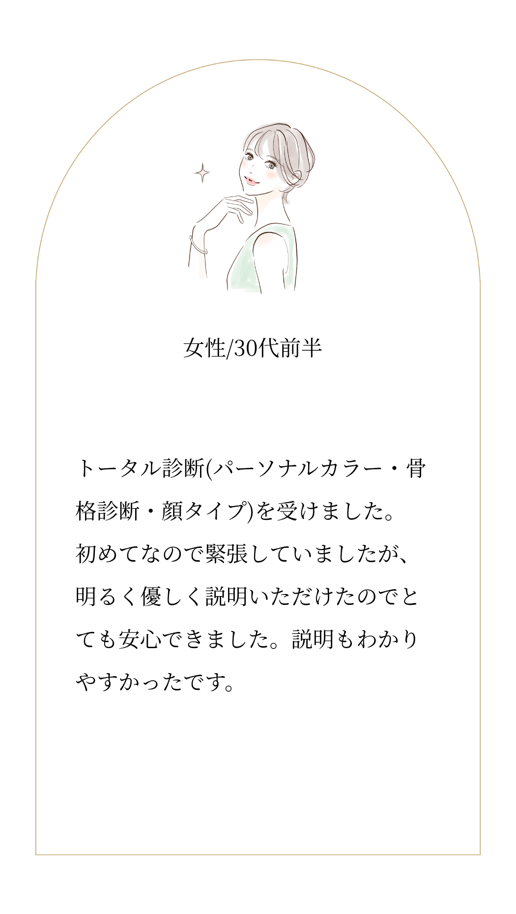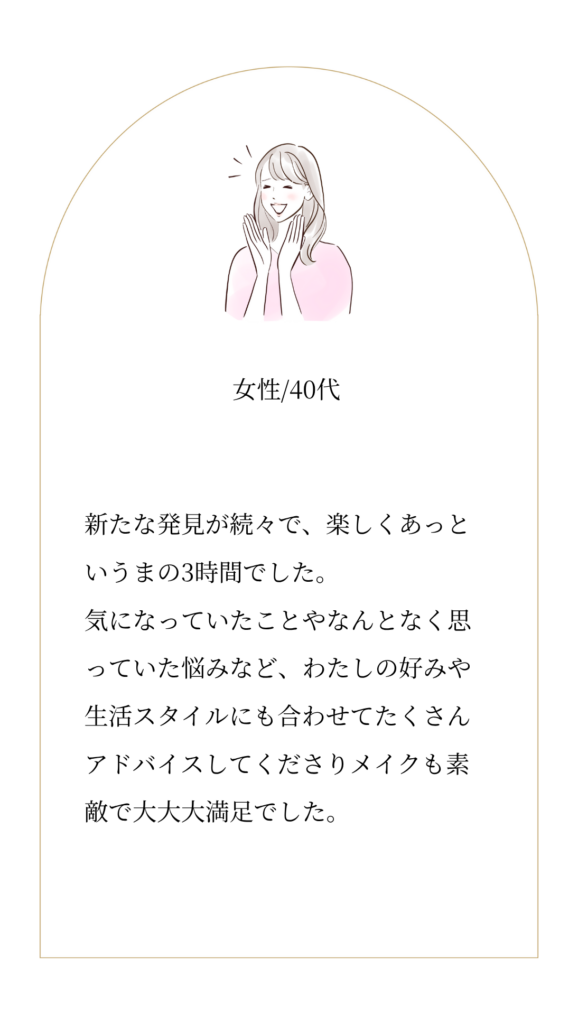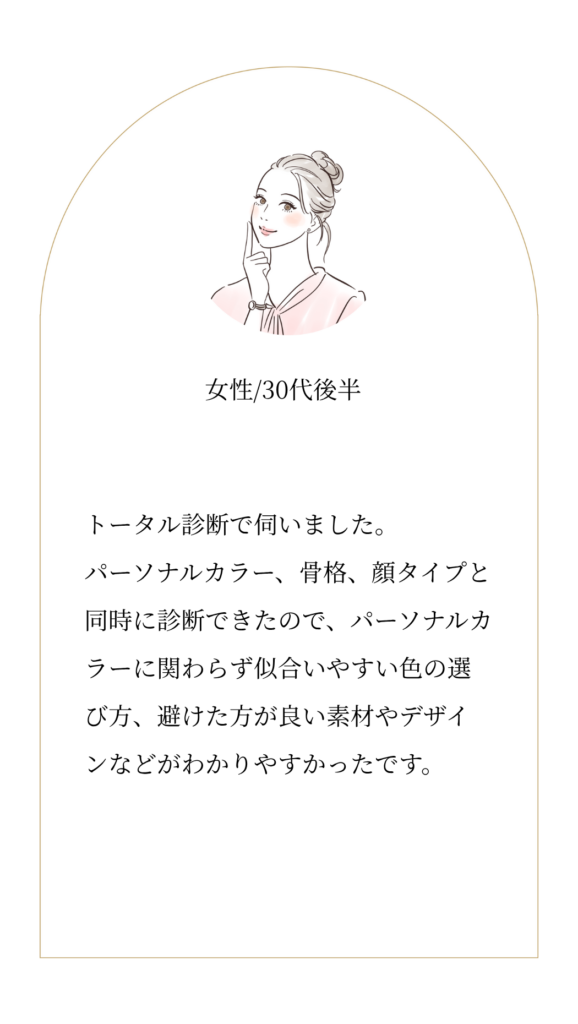 | 3時間 28,500円 | ・パーソナルカラー診断、骨格診断、顔タイプ診断 ・【似合う】ファッション、コスメ、ヘアスタイル、アクセサリーなどをご提案 |