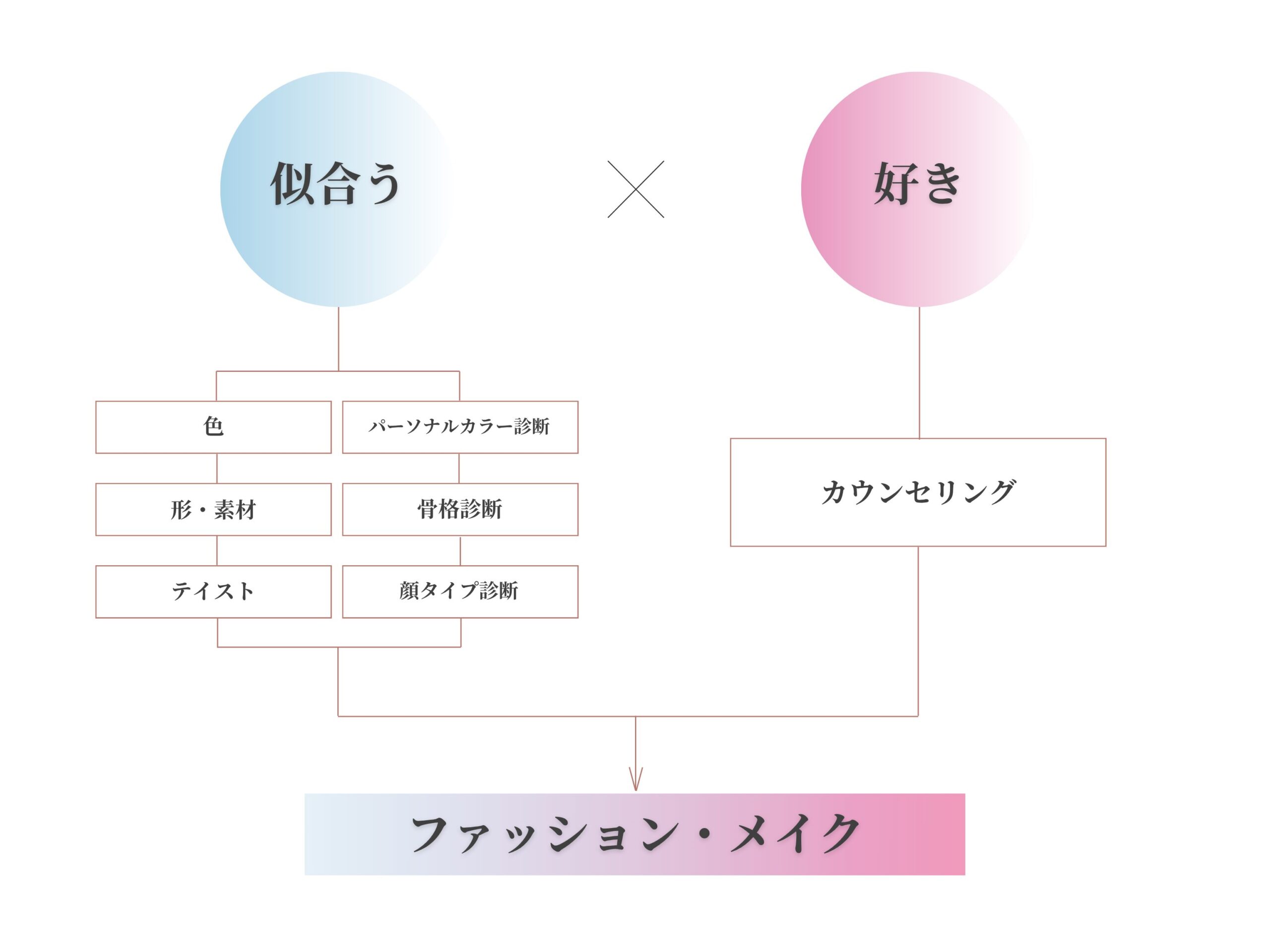 また、【似合う】ファッション・メイク・ヘアスタイル・アクセサリー等をお伝えした上で、なりたいイメージや好きなアイテム【好き】と掛けあわせて、好きな服を素敵に着るためのコーディネートをご提案します。